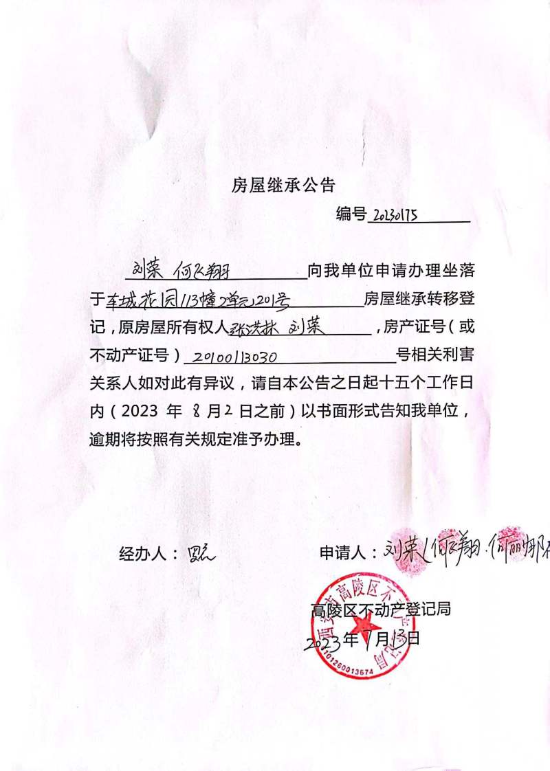 劉榮、何飛翔房屋繼承公告 編號(hào):20230175