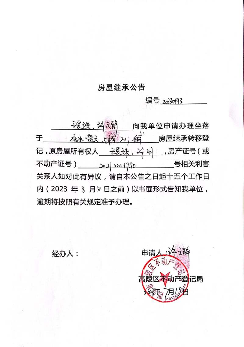 王愛珠、許文靜房屋繼承公告 編號:20230193