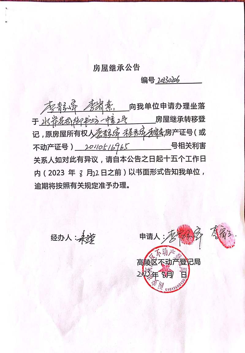 李靜峰、李宥熹房屋繼承公告 編號(hào):20230206