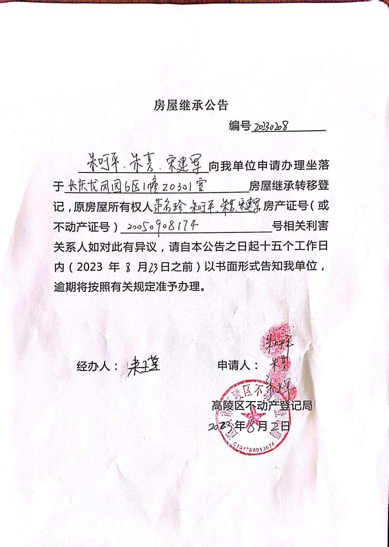 朱吁平、朱芳、宋建軍房屋繼承公告 編號:20230208