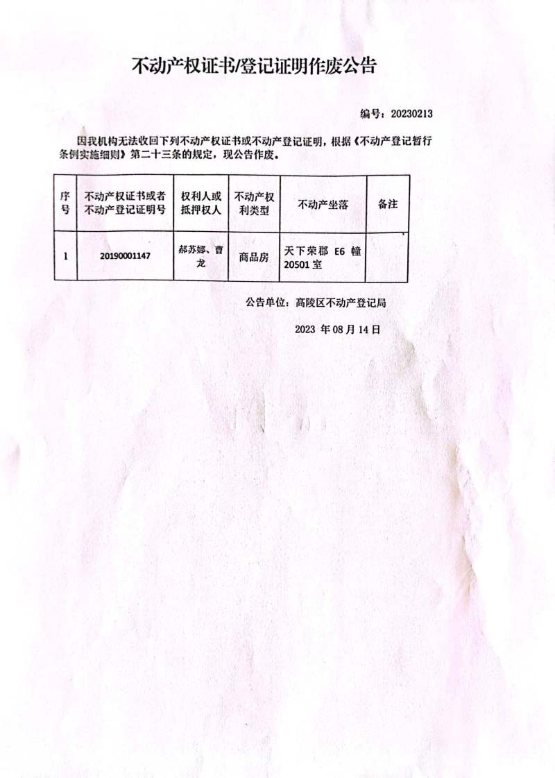 郝蘇娜、曹龍不動(dòng)產(chǎn)權(quán)證書或房屋所有權(quán)證作廢公告編號(hào):20230213