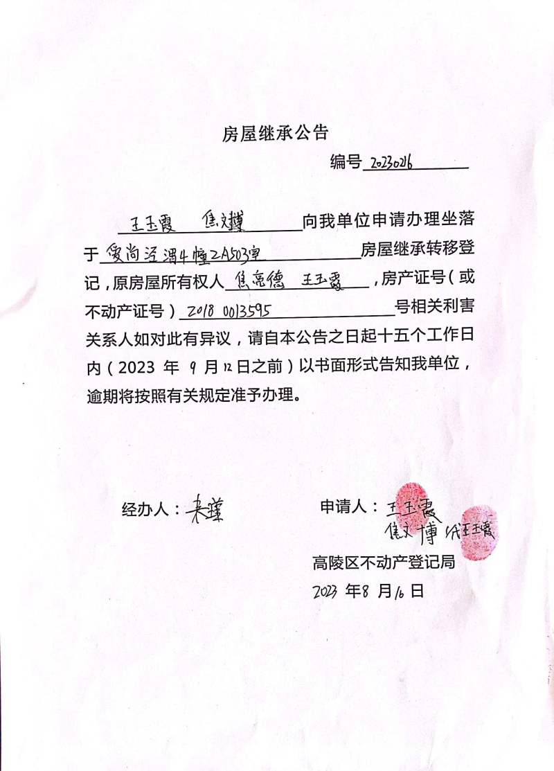 王玉霞、焦文博房屋繼承公告 編號:20230216