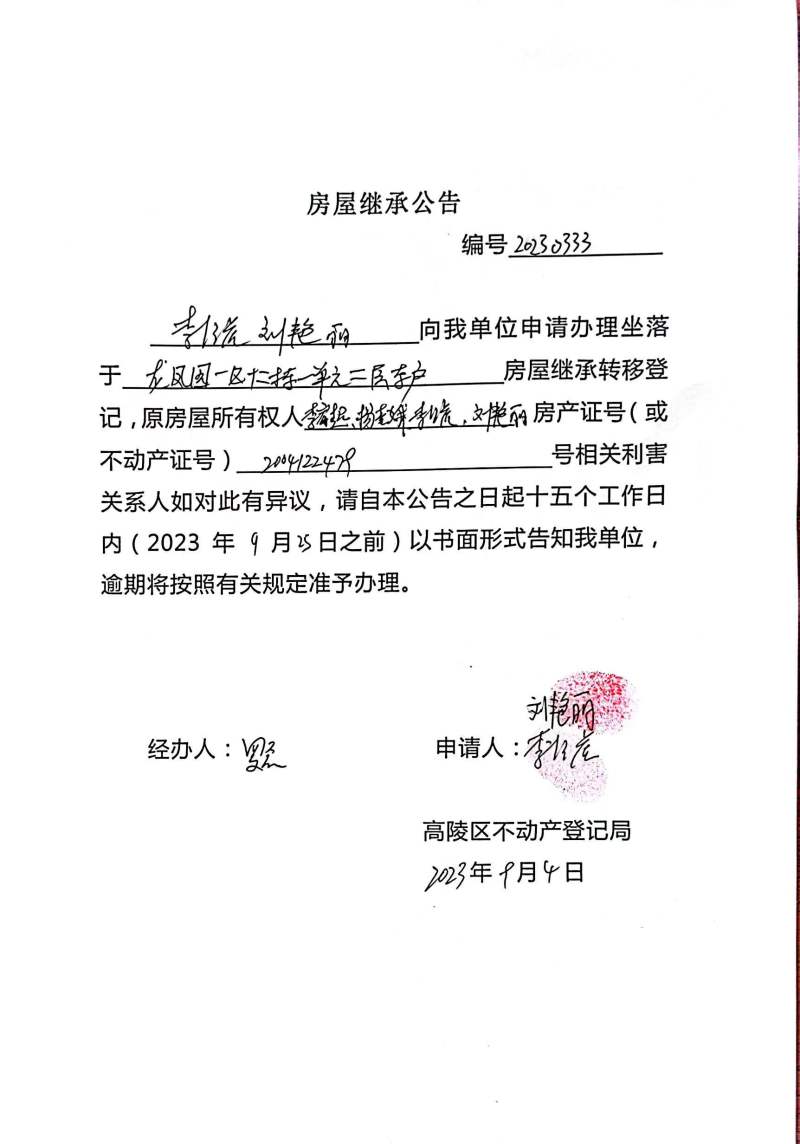 李涇虎、劉艷麗房屋繼承公告 編號:20230333