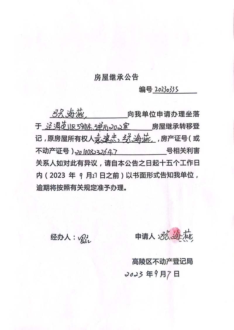 張海燕房屋繼承公告 編號:20230335