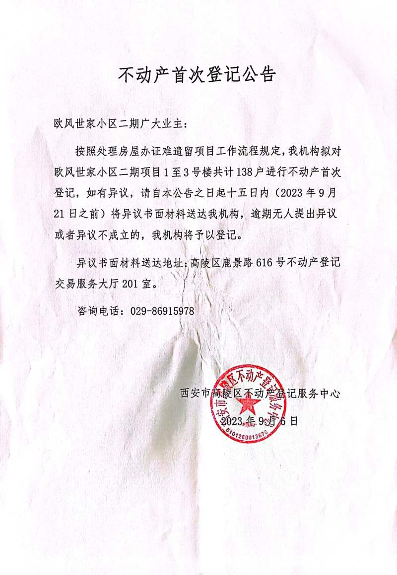 不動(dòng)產(chǎn)首次登記公告(歐風(fēng)世家小區(qū)二期)