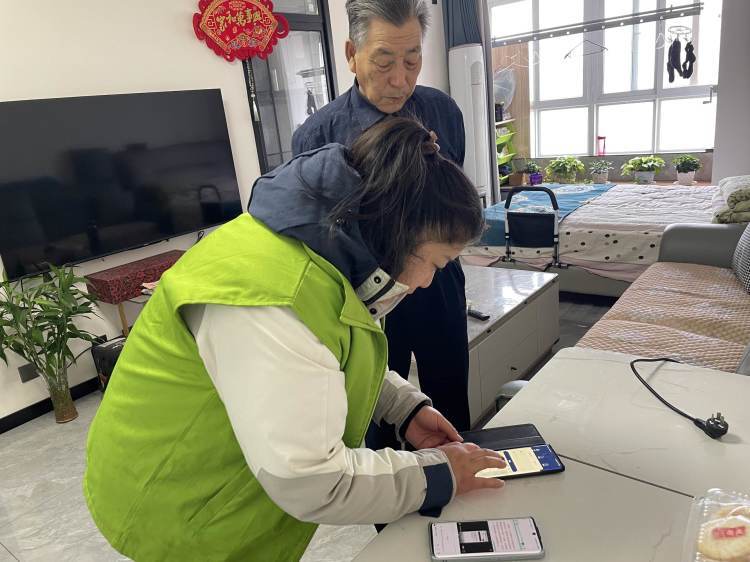 針對小區年齡偏大,兒女又不在身邊的老年人,社區工作人員提供上門服務,為涇渭國際城小區居民上門在手機上幫助其辦理養老認證,方便居民生活。