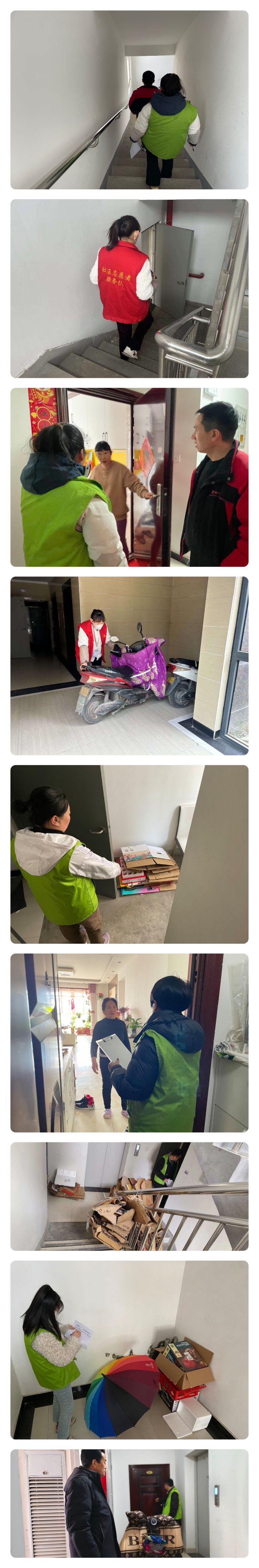 社區工作人員在小區開展禁止電動車入樓入戶和樓道垃圾清理工作。工作人員對小區內每棟樓進行了巡查,檢查是否有電動車違規入樓和垃圾堆放現象,將停放在樓內的電動車移至車棚內,及時入戶勸導清理樓道垃圾。