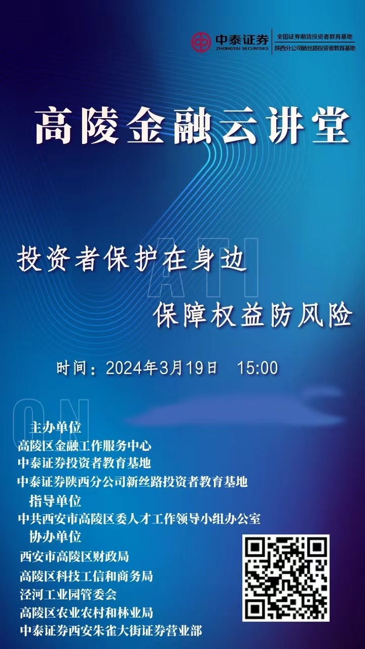 為貫徹落實(shí)中央金融工作會(huì)議精神,做好金融服務(wù)“五篇大文章”,優(yōu)化金融營(yíng)商環(huán)境,持續(xù)加強(qiáng)企業(yè)掛牌上市宣傳,結(jié)合多層次資本市場(chǎng)發(fā)展,提升轄區(qū)企業(yè)及投資者風(fēng)險(xiǎn)應(yīng)對(duì)能力和可持續(xù)金融發(fā)展,3月19日,高陵區(qū)金融工作服務(wù)中心聯(lián)合中泰證券陜西分公司新絲路投資者教育基地、新浪財(cái)經(jīng)組織開(kāi)展了“高陵金融云講堂”系列活動(dòng)之“投資者保護(hù)在身邊?保障權(quán)益防風(fēng)險(xiǎn)”宣傳培訓(xùn)活動(dòng)。本次專(zhuān)題培訓(xùn)共2300余人次在線參與。