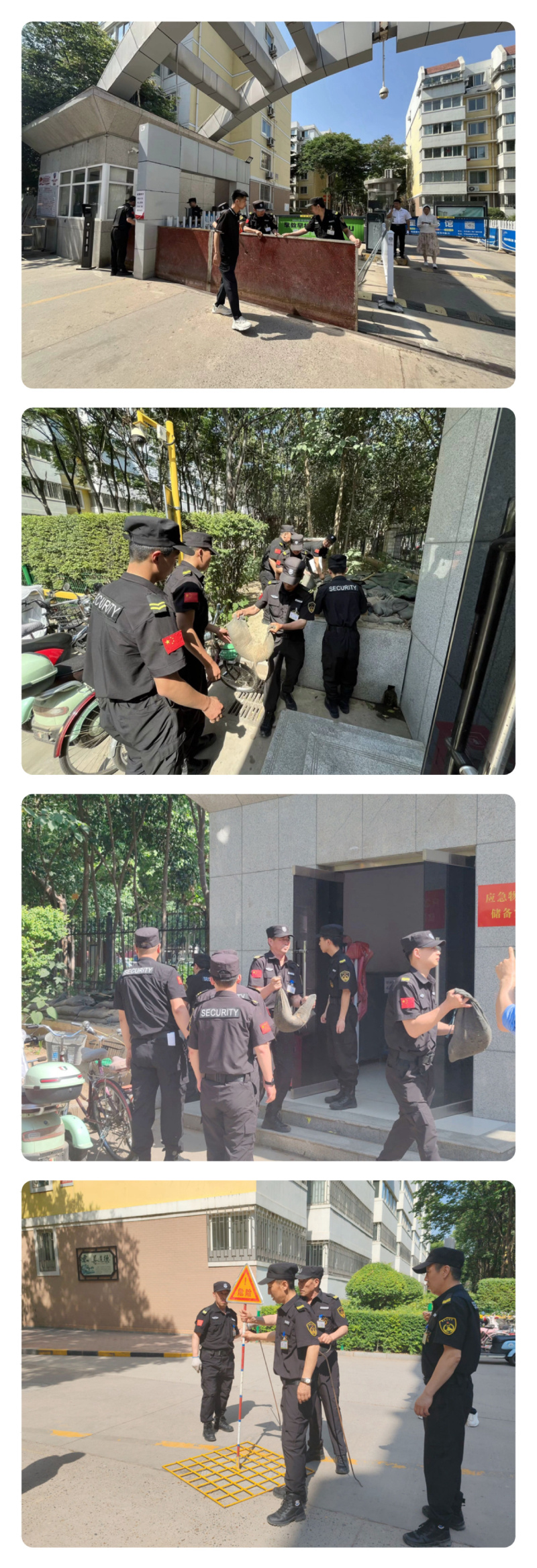 針對汛期強降雨天氣可能引起的洪澇災害,此次應急演練根據防汛應急預案的相關要求,模擬在遭遇極端暴雨天氣時,長慶龍鳳園小區秩序管理部隊員在值勤過程中,發現3號大門外長慶大道排水不暢,積水很深,水流由大門外側向3號大門內主干道以北方向涌入。接到汛情報告后,長慶龍鳳園社區迅速啟動社區防汛應急預案,依據現場實際情況,立即成立現場臨時搶險指揮小組,將所有人員分為三組,立即開展緊急救援工作。