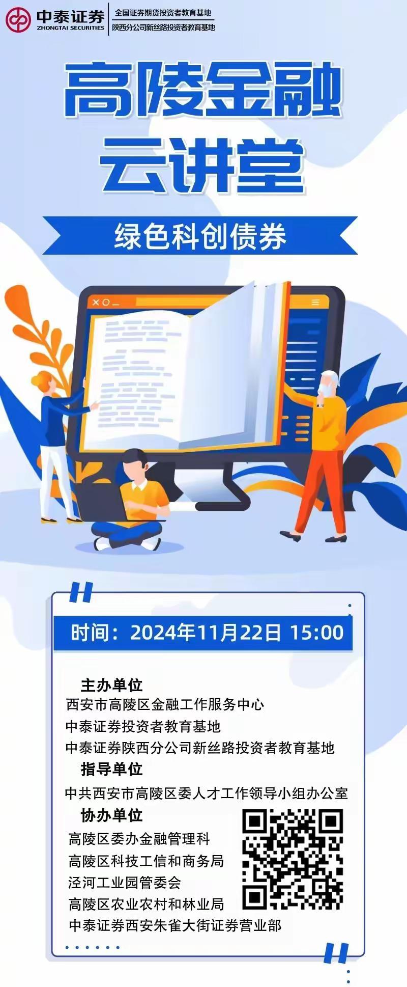 為持續優化轄區金融營商環境,做好企業掛牌上市宣傳培訓工作,結合當前多層次資本市場發展,引導轄區企業及投資者及時、準確地了解綠色債券及科創債券有關情況,11月22日,高陵區金融工作服務中心聯合中泰證券陜西分公司新絲路投資者教育基地、上海傲度金融信息服務有限公司、新浪財經等機構,組織舉辦了“高陵金融云講堂”系列活動之“綠色科創債券”宣傳培訓活動。本次活動共有1200余人次在線參與。