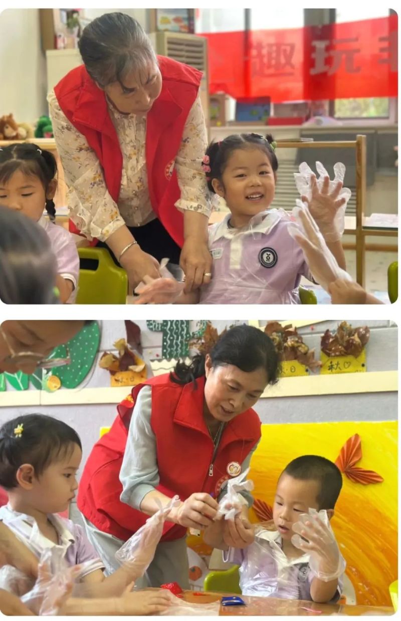 活動現場,社區非遺傳承隊許奶奶手持傳統拓印工具,向孩子們演示“上紙、沾墨、捶打”的完整工藝流程。“小朋友們看,這個拓包要像小兔子跳跳一樣輕輕拍打。”銀齡志愿者們化身為“銀發教師”,分組指導幼兒操作。在志愿者指導下,30名幼兒完成了自己的非遺“首秀”。