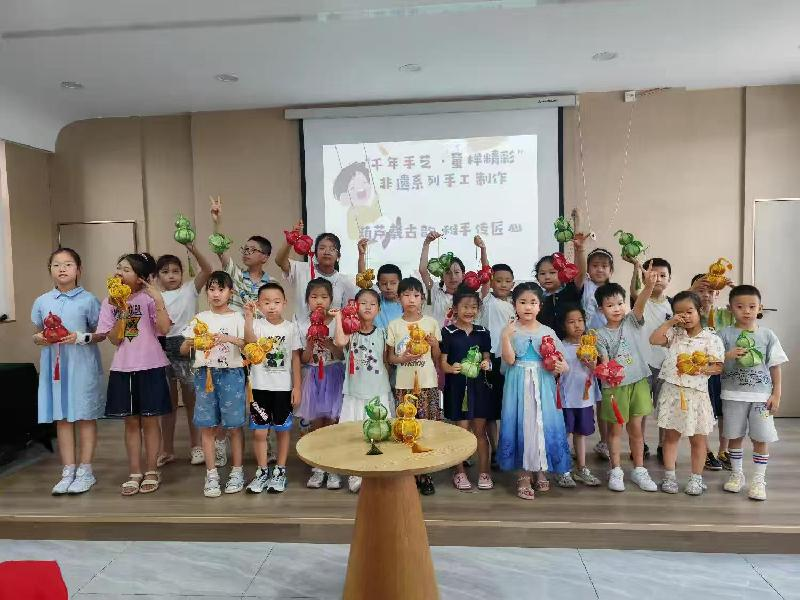 在志愿者的幫助下,現場氛圍愈發熱烈,大家都專注地投入到手工制作中,勾勒出一幅溫馨的互動畫卷。經過近一小時的專注制作,一個個承載著創意與心意的手工葫蘆陸續完成?;顒游猜暎⒆觽兣e著色彩鮮艷的成品,背景屏幕上"千年手作,非遺系列手工制作"的字樣格外醒目,熱鬧的場面里滿是對自己勞動成果的珍視與對非遺文化的熱情。
