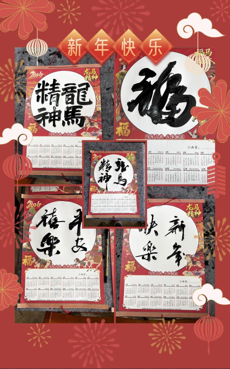 活動(dòng)現(xiàn)場,退休老干部和大學(xué)生志愿者端坐案前,筆鋒蒼勁有力,落筆沉穩(wěn)大氣,筆下的“福”字圓潤飽滿,“平安喜樂”“福壽綿長”等祝福語筆力遒勁,每一筆都飽含著對鄰里的深切關(guān)懷,對新春的美好期許。一張張空白日歷,在大家的共同努力下,變得色彩斑斕、寓意深遠(yuǎn)。