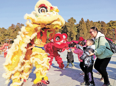 河南南陽臥龍崗文化園內,市民在欣賞舞獅表演