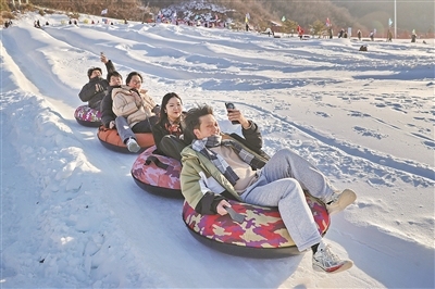 | 冰雪游 河北省秦皇島市海港區石門寨鎮老君頂景區,游客在體驗雪圈項目。 曹建雄攝(影像中國) |