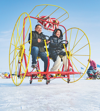 | 冰雪游 新疆維吾爾自治區昌吉回族自治州呼圖壁縣五工臺鎮百泉湖,游客在體驗雪地自行車。 陶維明攝(影像中國) |