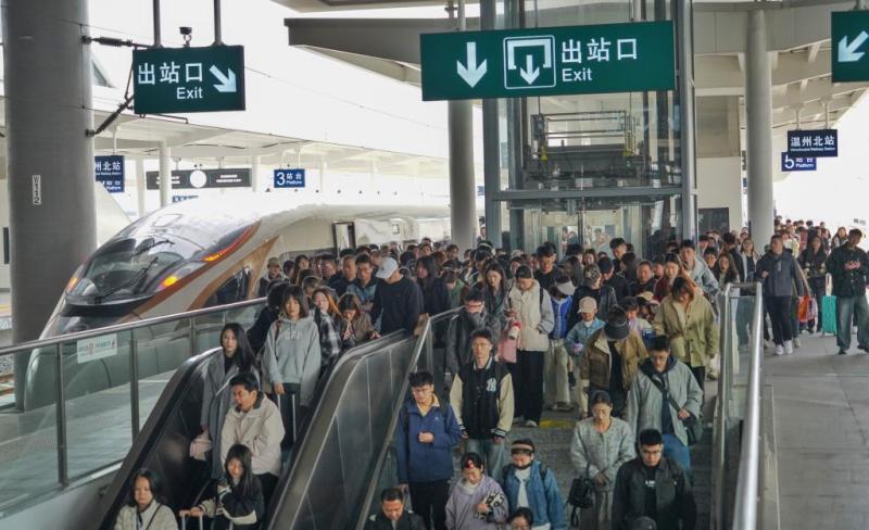 4月4日,在浙江省溫州北站,抵達(dá)的乘客提著行李有序離開站臺(tái)。新華社發(fā)(蘇巧將攝)