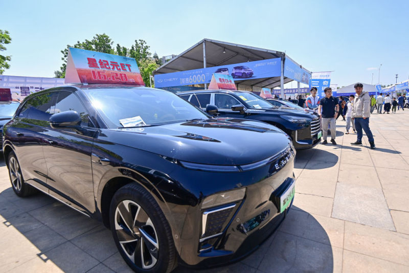 5月3日,消費者在山東省青州市舉辦的“汽車·房產家居文化節”上參觀選購展出的汽車。2025年“五一”假期,全國消費市場繁榮活躍。新華社發(王繼林攝)