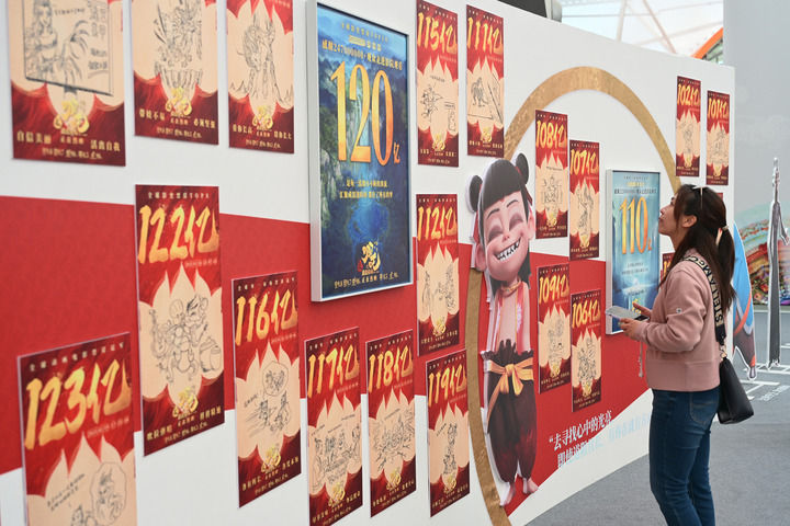 2025年4月19日,觀眾在電影《哪吒之魔童鬧海》手繪海報展上參觀。新華社記者 李鑫 攝