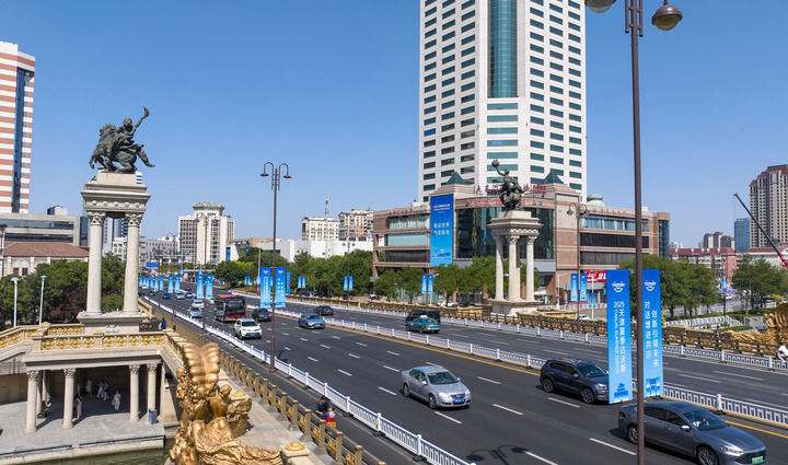 天津市大光明橋道路兩旁路燈上懸掛著2025夏季達沃斯論壇宣傳標(biāo)語(6月21日攝)。