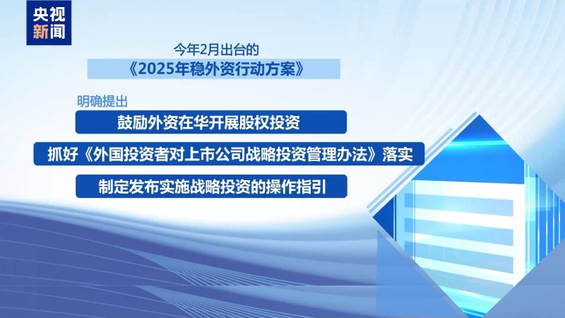 今年2月出臺的《2025年穩(wěn)外資行動方案》明確提出:鼓勵外資在華開展股權(quán)投資,抓好《外國投資者對上市公司戰(zhàn)略投資管理辦法落實》,制定發(fā)布實施戰(zhàn)略投資的操作指引,還提出取消外商投資公司使用境內(nèi)貸款限制、鼓勵外國投資者投資設(shè)立投資性公司、便利外國投資者在華實施并購?fù)顿Y等。