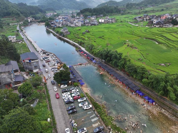游客在廣西柳州市融水苗族自治縣香粉鄉雨卜村戲水消暑(7月19日攝,無人機照片)。新華社記者 黃孝邦 攝