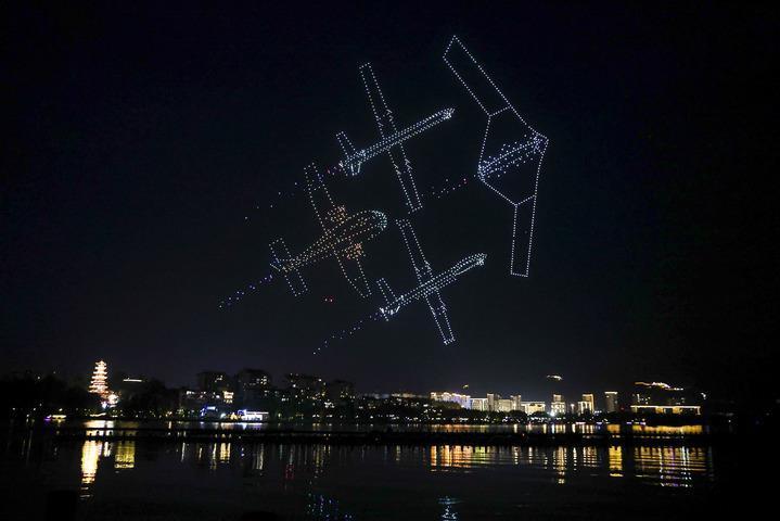 這是7月11日晚在重慶市梁平區雙桂湖國家濕地公園拍攝的無人機表演。新華社記者 黃偉 攝