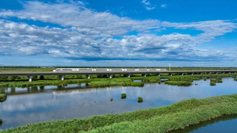8月17日,一列動車組列車正行駛在哈齊高鐵線上(無人機照片)。新華社發(原勇攝)