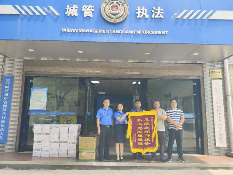 6月18日上午,兩名男子來到區(qū)城管執(zhí)法局城區(qū)執(zhí)法大隊(duì),將一面寫有“危難之際伸援手,熱心為民顯擔(dān)當(dāng)”的錦旗,送到了負(fù)責(zé)同志手中,并貼心地送來了許多夏令品,在贈送錦旗的現(xiàn)場,家屬們激動地說:“城管隊(duì)員們的善舉讓我們非常感動,就是你們的及時救助才讓我們的親人轉(zhuǎn)危為安,這份恩情我們永遠(yuǎn)銘記,前面一直希望能當(dāng)面道謝,都被咱工作人員婉言謝絕了,今天說啥,也得表示一下我們的感激之情!”城管隊(duì)員們則表示,群眾遇到了困難,我們伸出援助之手既是職責(zé)所系,也是新時代城管人的使命擔(dān)當(dāng)。