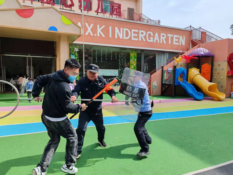 戶外演練環節進一步模擬了復雜場景下的處置流程。民警們在幼兒園外的彩色地面區域展開進階演練:面對“情緒激動人員”試圖強行闖入的突發狀況,警員們交替使用盾牌格擋與警棍威懾,精準完成“語言警告—裝備阻隔—合力控制”的標準流程。從裝備使用到人員控制,各環節銜接緊密,既體現了應急隊伍的專業素養,也為在場觀摩的師生直觀展示了安全事件的應對方法。