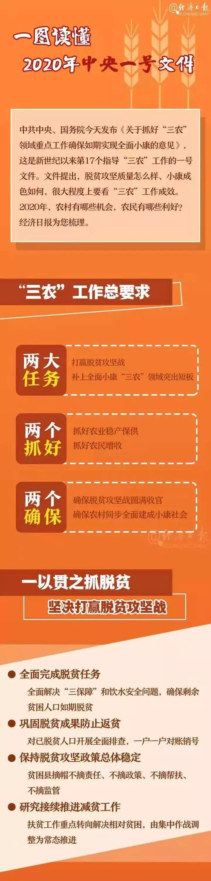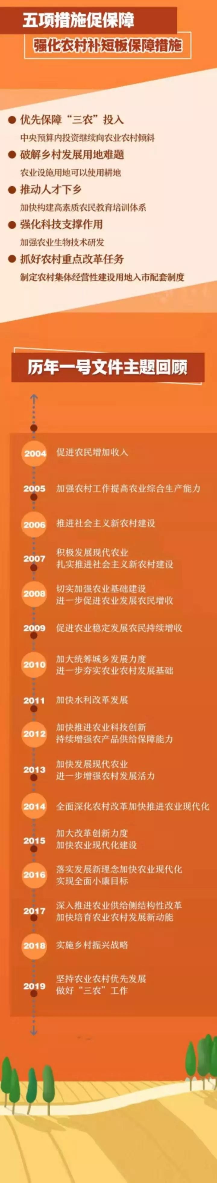 今年中央一號文件以習近平新時代中國特色社會主義思想為指導,全面貫徹黨的十九大和十九屆二中、三中、四中全會精神,貫徹落實中央經濟工作會議精神,對“三農”工作作出了全面部署。一是明確了工作重點,就是對標對表全面建成小康社會目標,集中力量完成打贏脫貧攻堅戰和補上全面小康“三農”領域突出短板兩大重點任務。二是強化了政策舉措。針對基層干部群眾反映強烈的問題和工作落實中存在的薄弱環節,有的放矢、精準施策,提出了一些含金量高、可操作性強的政策舉措,進一步強化了補短板的政策支撐保障。三是強調了抓好落實。圍繞補上影響脫貧攻堅質量和全面小康成色、到2020年必須補上的突出短板,逐項抓好落實,確保如期完成。