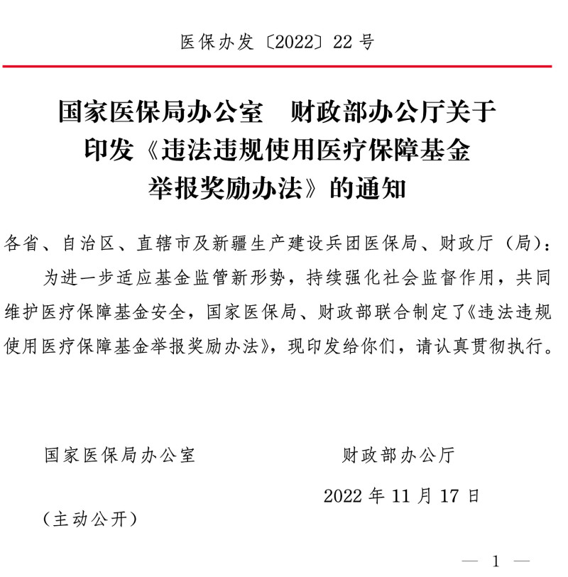 第十五條本辦法由國(guó)家醫(yī)保局、財(cái)政部負(fù)責(zé)解釋,自2023年1月1日起施行。《國(guó)家醫(yī)療保障局辦公室 財(cái)政部辦公廳關(guān)于印發(fā)〈欺詐騙取醫(yī)療保障基金行為舉報(bào)獎(jiǎng)勵(lì)暫行辦法〉的通知》(醫(yī)保辦發(fā)〔2018〕22號(hào))同時(shí)廢止。
