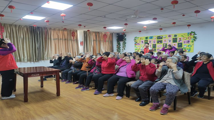 活動開始前,現(xiàn)場工作人員和志愿者幫助攙扶老人有序就坐,伴著輕快的音樂,大家一起做起了手指健腦操,快樂地“舞動手指”,現(xiàn)場每個人臉上洋溢著幸福的笑容。