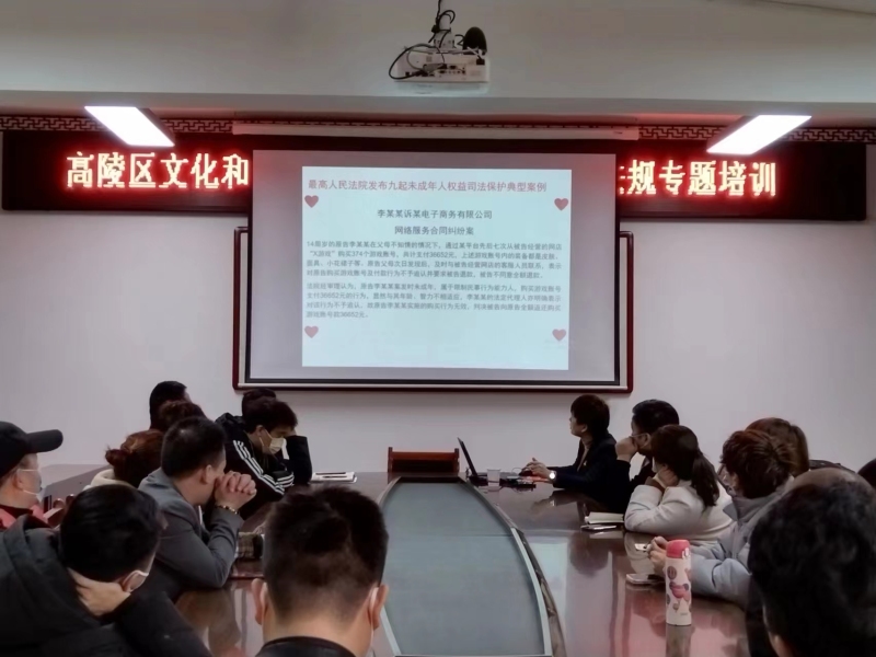 為貫徹落實習近平總書記關于未成年人保護工作重要指示批示精神,做好未成年人關愛保護工作,以促進未成年人健康成長為出發點和落腳點,增強未成年的幸福感和安全感,引導文旅行業經營者做好未成年人的守護人,3月17日,高陵區文化和旅游體育局組織開展未成年人保護工作業務培訓會。邀請武潤娜律師就未成年人保護方面的法律法規和最新有關政策進行培訓,區文旅行業網吧、KTV、游藝廳各負責人共計20余人參加了培訓。