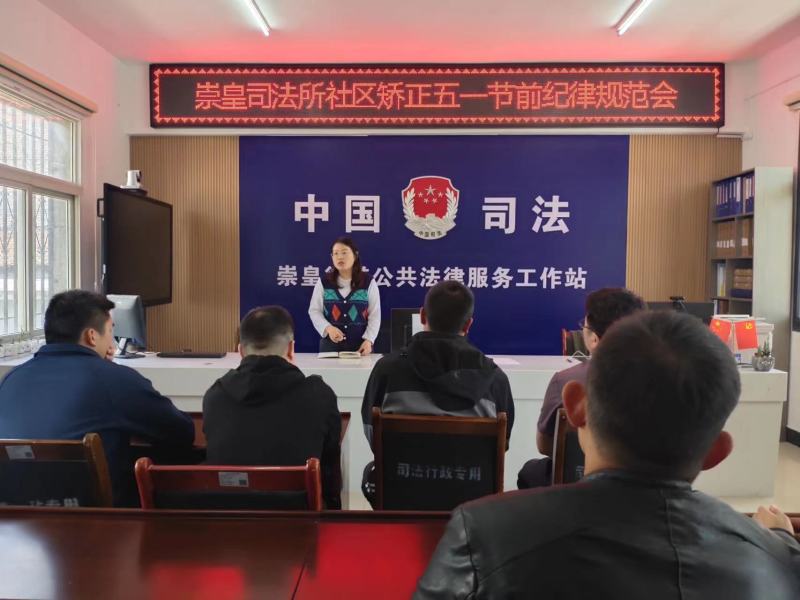 臨近五一,按照社區矯正工作要求,加強社區矯正對象重要節假日期間的監督管理工作,2023年4月26日上午,崇皇司法所組織轄區15名社區矯正對象進行五一節前紀律規范會。