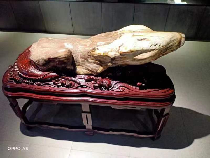 賞析內容:這方造型獨特的奇石,有人說像鱷魚、有人說像蜥蜴,這其實是一塊木化石,它的形成是木頭被迅速埋在地下后,地下水中的二氧化碳填充了木頭內部,經過億萬年的時間形成木化石。樹化玉是玉化的硅化木,以特殊身價不但展示玉石富貴,同時美麗的年輪和樹皮的滄桑記錄著、提供著遠去的那個年代的若干信息。