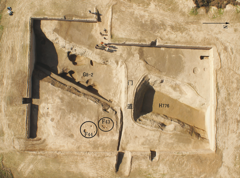 在西段環壕中部發現一處門址,這也是目前發現的唯一一處門址,由門道、兩側環壕、門房、排水溝等設施組成。門道為挖筑環壕時在此處預留的生土過道,寬2—4米,有明顯踩踏痕跡,基本與環壕內外活動面處于同一平面,中部略低。門道兩側為向下挖建的壕溝(原編號分別是G8-2和H776),溝內堆積十分豐富,根據土質土色可劃分為16小層,7大層。堆積中出土了大量陶、骨及石質文物,陶器有重唇口尖底瓶、卷沿彩陶盆、缽、夾砂罐、筒形罐、大口罐釜、灶、器蓋等,還出土陶杯、陶刀、陶環、陶紡輪等小件陶器。石骨器有石鏟、石球、石環、骨簪、骨笄[jī]、骨錐等。最為重要的是在1—4層中發現了大量成層分布的器物,出土陶器數量近千件,且這些陶器基本保存完好,最具代表性的有鏤空人面像覆盆形器、動物紋彩陶盆、涂朱砂的人面塑殘陶器等,這些陶器均為同時期遺址中所罕見。大量完整陶器擺放于此,明顯是楊官寨史前先民有意所為,可能與舉行的某種宗教活動有關。門道內側發現兩座房址,應為在出入口附近設置的“門房”一類防衛設施,均為地面式房址,保存狀況一般,只殘留地面和灶坑,房址平面近圓形。F43直徑約4.5米,面積約15.5平方米,留有兩個門道,一個朝向北側的通道,一個朝向南側。F44直徑約6.5米,面積約34平方米,門道不清。還在環壕內側、房址北側發現一條小溝與環壕相接,溝寬0.55米、深0.5米,可能是排水溝類遺跡。