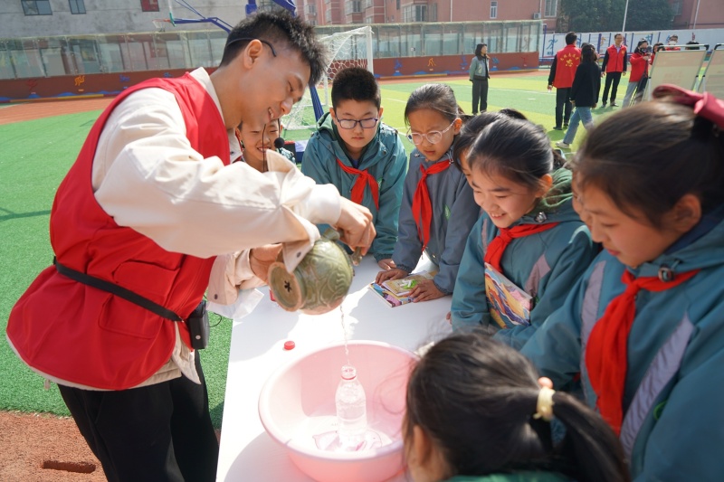 室外展區,志愿者通過倒流壺向學生演示了文物內藏的科技原理;文物知識展板前,孩子們在志愿者的精彩講解下“云游”博物館。孩子們在歡聲笑語中參與文博科普知識互動、體驗VR實景博物館等項目。“我今天學到了很多歷史知識,戴上VR眼鏡仿佛進入了博物館,今后我要好好學習,長大為祖國作貢獻!”四年級(4)班學生胡欣彤說