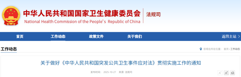 《中華人民共和國突發公共衛生事件應對法》(以下簡稱《突發公共衛生事件應對法》)已于2025年9月12日經第十四屆全國人民代表大會常務委員會第十七次會議審議通過,自2025年11月1日起施行。為做好《突發公共衛生事件應對法》貫徹實施工作,現就有關事項通知如下: