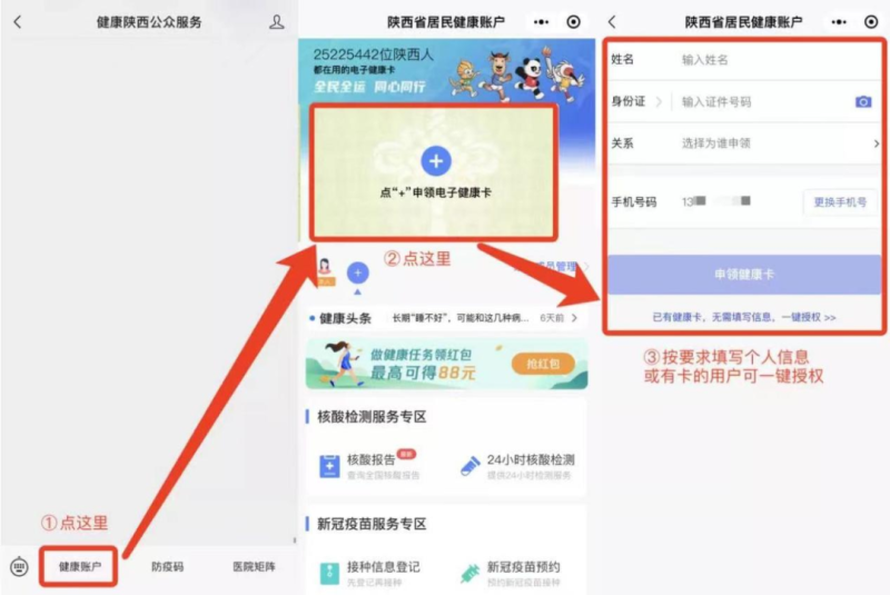 點擊底部菜單欄“健康賬戶”→“點+申領電子健康卡”→按要求填寫個人信息/有卡用戶可一鍵授權→成功申領電子健康卡