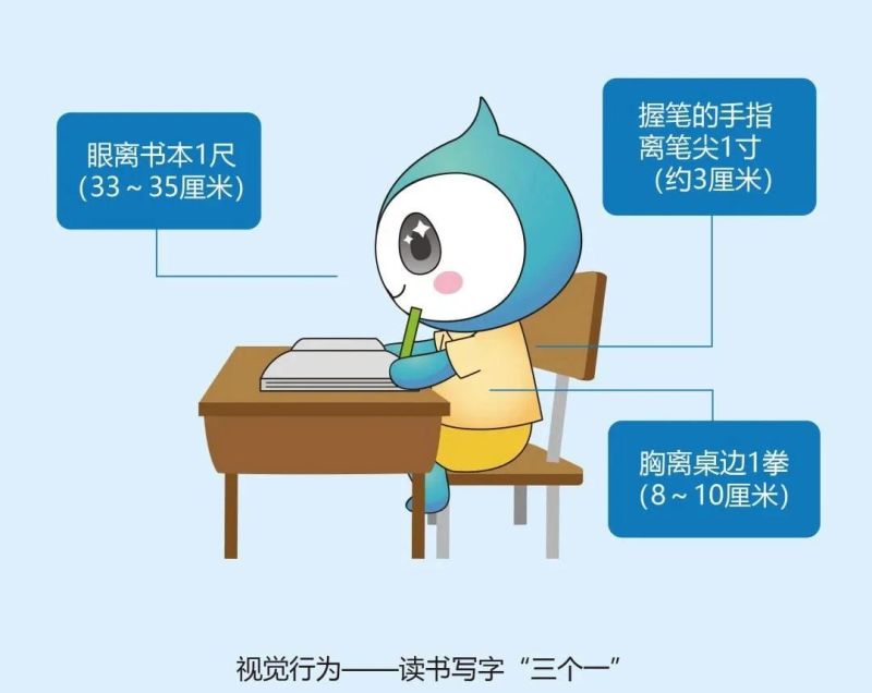 閱讀和寫字時,要做到頭正、身直、臂開、足安。保持眼睛與書本距離為33-35厘米。胸與桌子距離約為一拳,握筆的手指與筆尖距離為3厘米。筆桿與紙面的角度為40-50度之間。
