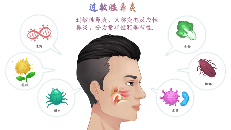 過敏性鼻炎是一種常見的過敏性疾病,是機體被過敏原致敏后由免疫球蛋白E(IgE)介導的Ⅰ型超敏反應性疾病,其發病機制十分復雜。簡單來說,就是易感個體接觸過敏原之后,自身免疫系統過激反應,進而導致鼻粘膜發生炎癥。我國不同地區的過敏原存在差異,如華南地區以屋塵螨為主,西北地區的過敏原主要為艾蒿、豚草和蒲公英花粉等。