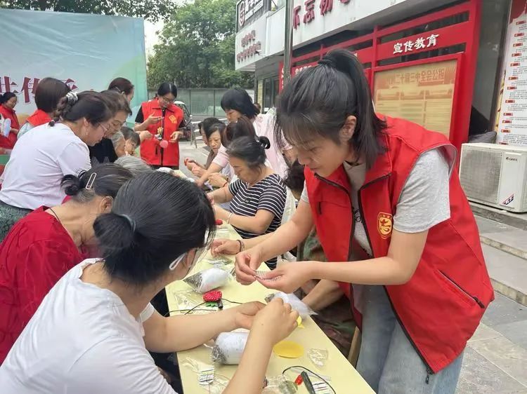 在民俗體檢區,傳統習俗體驗精彩紛呈。充氣龍舟趣味賽中,居民與志愿者組隊協作,伴著陣陣吶喊聲奮力“劃槳”,感受龍舟競渡的熱血與團結;包粽子攤位前,老手新手齊上陣,從粽葉折疊到糯米填充,包出傳統三角粽、枕頭粽。葉折疊、餡料調配,現場飄滿糯米清香;香囊DIY區域,在志愿者指導下學習,居民縫制艾草香囊,將祈福納祥的美好寓意縫入五彩絲線。活動不僅讓居民沉浸式體驗端午文化,更促進了親子互動與鄰里交流。