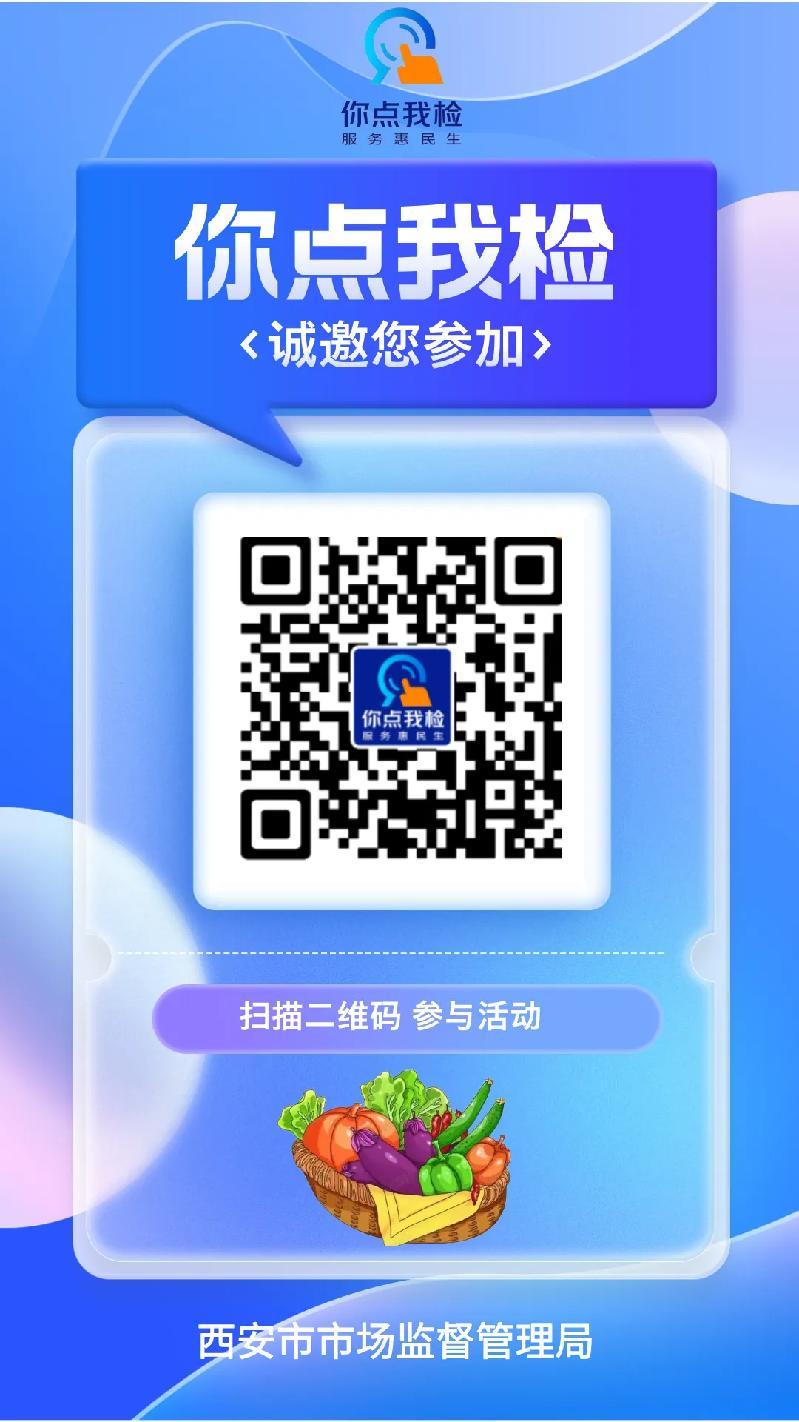 “民以食為天,食以安為先”,為了讓市民朋友吃得更開心、吃得更放心,西安市市場監管局誠邀您參加“你點我檢 服務惠民生”活動。通過線上征集您最關注的食品安全問題,按照食品安全監督抽檢程序要求,開展食品安全專項抽樣檢驗,并及時向社會公布抽檢結果,回應您對食品安全的重要關切。