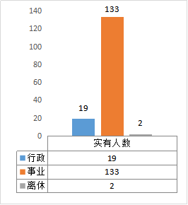 截至2018年底,本部門人員編制106人,其中行政編制11人、事業編制95人;實有人員154人,其中在職行政19人、事業133人;單位管理的離休人員2人。