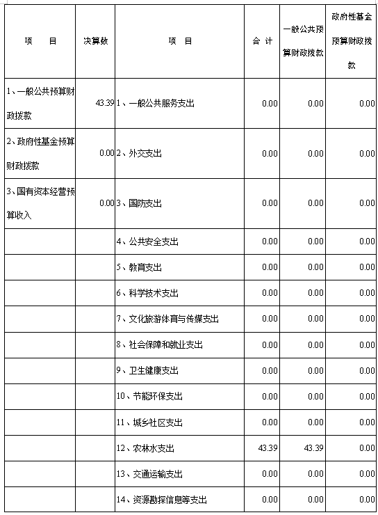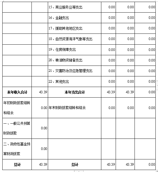 收入總計43.39萬元。包括:公共預算財政撥款收入43.39萬元,政府性基金預算財政撥款收入0.00萬元,事業收入0元,其他收入0元,公共預算財政撥款比上年增加28.29萬元,政府性基金預算財政撥款與上年持平,主要原因沒有發生。