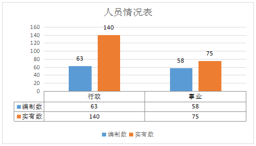 截至2019年底,本部門人員編制121人,其中行政編制63人、事業編制58人;實有人員215人,其中行政140人、事業75人。單位管理的離退休人員1人。