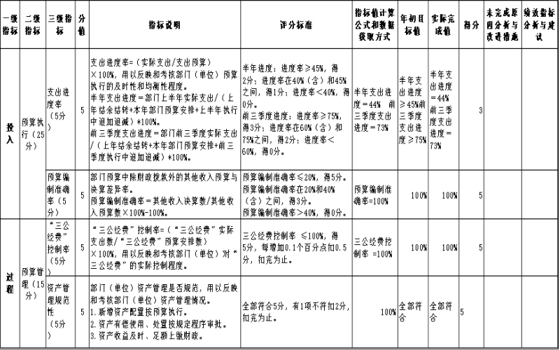 | 績 效 指 標(biāo) | 一級(jí)指標(biāo) | 二級(jí)指標(biāo) | 三級(jí)指標(biāo) | 年度 指標(biāo)值 | 實(shí)際 完成值 | 分值 | 得分 | 偏差原因分析及改進(jìn)措施 |
