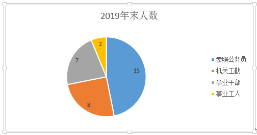 截止2019年底,單位編制人數25人,年末實有人數32人,其中參照公務員管理15人,機關工勤8人,事業干部7人,事業工勤2人。