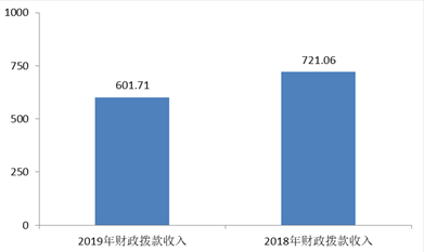 2019年度財政撥款收入總體情況及比上年減少16.55%,主要原因為2019年央省項目資金下達較晚,未能支出就被財政收回,未列入2019年財政撥款收入內。